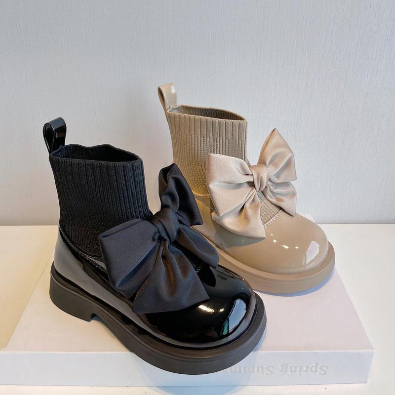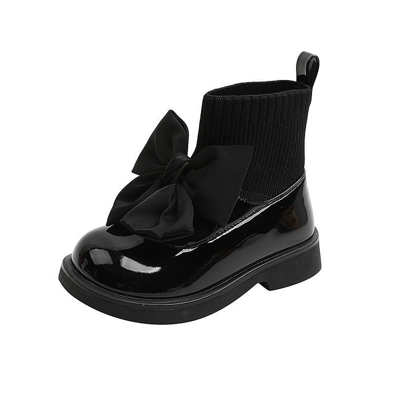 Kids Boots Fashion Pu Solid Black Bow Girls Uniform 2022 Spring And Autumn New Children’s Fashion Flying Knit School Socks Shoes