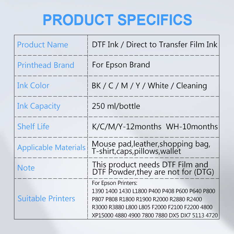 250ML/Set DTF Ink Direct to Transfer Film Ink For DTF PET Film Printing For Epson DX5 DX7 5113 4720 I3200 1390 1430 F2000 F2100